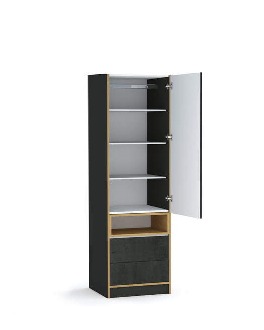Korpus, Umrandungen und Kästen in Eichenfarbe. Schwarze Front mit Betonmotiv.